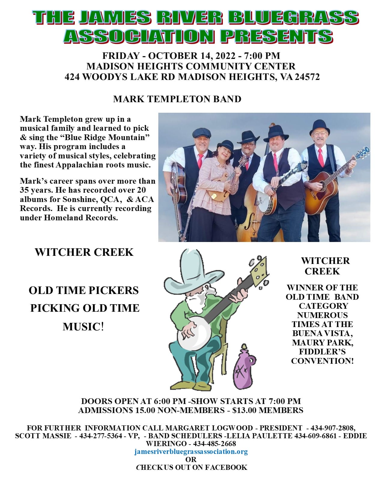 James River Bluegrass Association presents in concert Mark Templeton Band and Witcher Creek on Friday, October 14,2022 at 7:00 pm at the Madison Heights Community Center,424 Woodys Lake Rd,Madison Heights,VA. concessions available. Admission $15 non members,$13 members. For more information (434)907-2808.