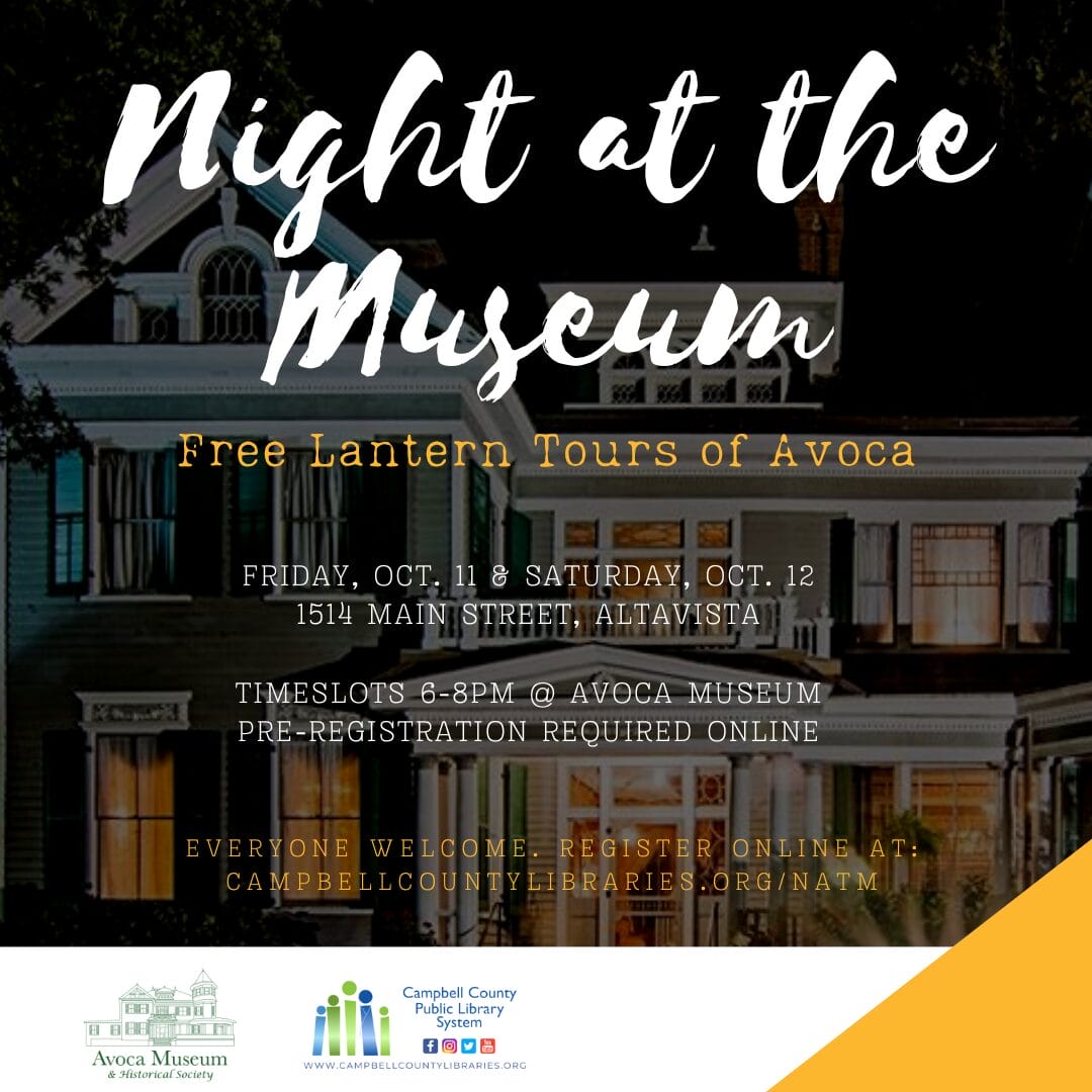 The Campbell County Public Library invites you to tour the Avoca Museum property for Night at the Museum. This historical presentation allows families to travel across Avoca’s beautiful grounds, listening to actors discuss their characters’ connections to the property. Tours will last about an hour. The event will be similar to a professional theater performance. For ages 10+. Pre-registration will be required online. For the registration link, go to our event page at https://campbellcountylibraries.org/natm/.