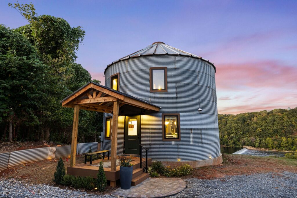 Stay in a luxury riverfront grain bin overlooking the James River—just half a mile from Downtown Lynchburg’s restaurants, shops, and scenic nature trails. This 27-foot silo home combines modern design with rustic charm for a truly unforgettable stay. Inside, guests can enjoy a king bed and queen pullout Murphy bed (sleeping up to 4), a full bathroom with shower and half bath, and a fully stocked kitchen with a dishwasher, Keurig Duo, and local coffee. The open-concept living space features a luxury fireplace, soaring 30+ ft ceiling, 8-foot ceiling fan, two smart TVs, and a washer and dryer for convenience. Outside, relax on the spacious deck with seating for four, a lounging sectional, fire pit, and gas grill—perfect for soaking up river views and quiet evenings under the stars.